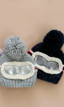The perfect beanie for little skiers and snowboarders. This Cream ski hat features a Navy, Cinnamon, Mustard, and Bowie Grey goggle band and a pom with silver metallic details. Pair with our Classic Cream, Navy, Cinnamon, or Bowie Grey Cardigan or Mittens for a complete look. Other colors available. - Designed in Salt Lake City - Crafted with care using 100% Hand-knit Acrylic - Hand wash and lay flat to dry
