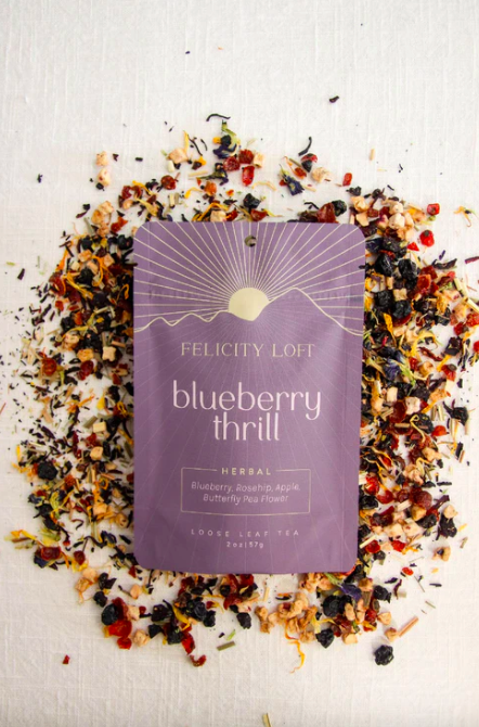 Blueberry Thrill is a fruity herbal infusion that brews a beautiful purple color. Blueberries, apple pieces, rosehips, butterfly pea flowers, hibiscus, lemongrass, and calendula combine to make a fruity drink that is delicious hot or cold.